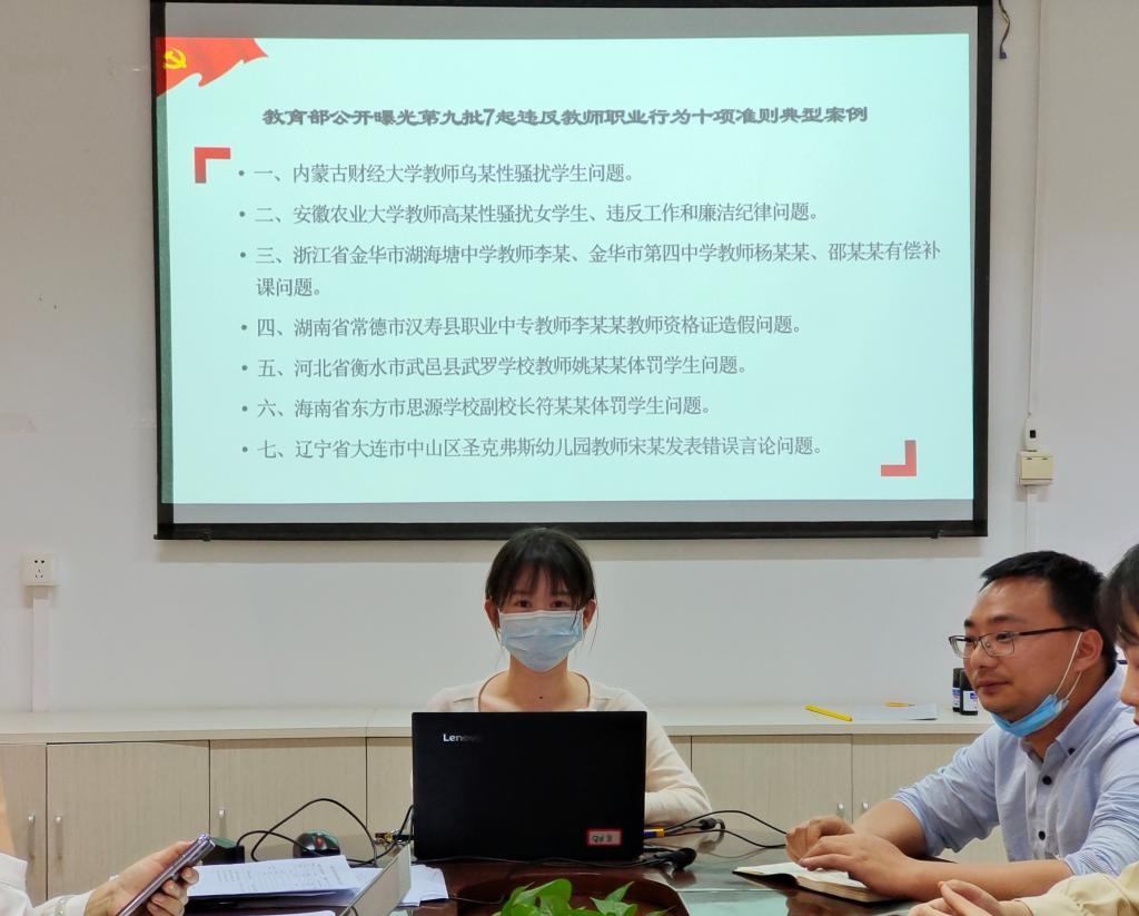 徐舒宁同志分享了《教育部公开曝光第九批7起违反教师职业行为十项准则典型案例》的心得体会。她强调,作为一名高校思政课教师,必须自觉地加强自身的职业道德修养,既要以学问教人,又要以道德范人。尤其是应不断加强自身的学术道德修养,做到自觉、自醒、自强、自重、自律,从而提高自己树立良好师德师风的自觉性,以自己高尚的品德塑造广大青年学生的人格和品质。