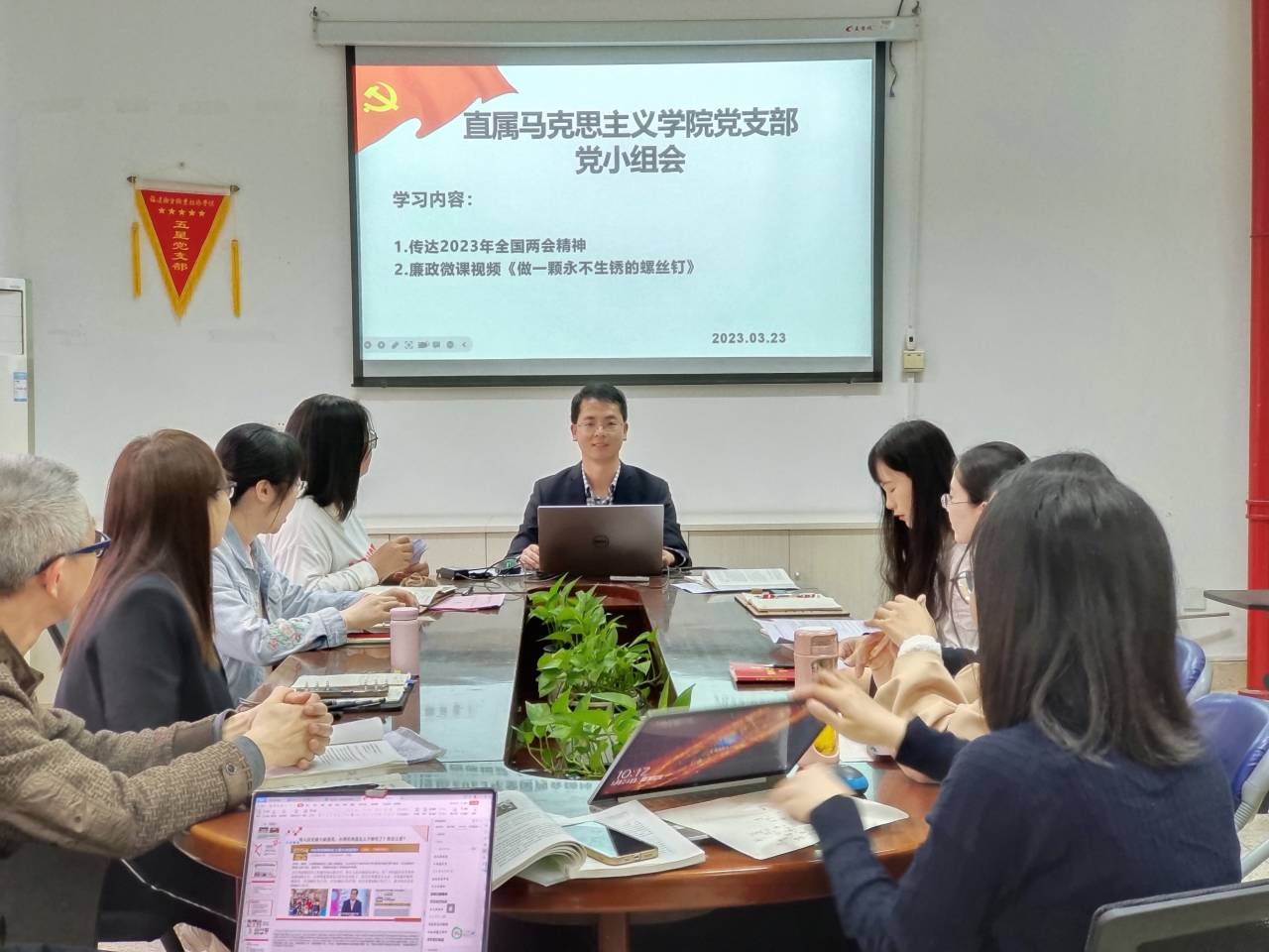 为贯彻落实全国两会精神,加强党风廉政建设,筑牢廉政思想防线。3月23日,直属马克思主义学院党支部以党小组的形式在行政楼107会议室开展理论学习暨党风廉政教育。