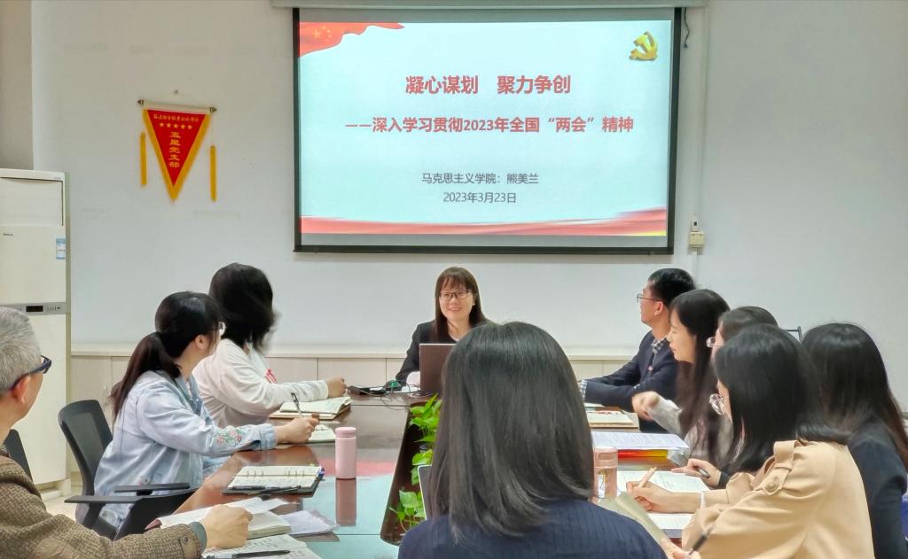 首先,党支部书记熊美兰以“凝心谋划 聚力争创——深入学习贯彻2023年全国两会精神”为题,为全体党员上了一堂精彩的党课。熊美兰从两会来龙去脉、两会热点重点聚焦、习近平总书记重要讲话精神、结合实际贯彻落实四个方面展开讲授,对“教育人才”“就业优先”等两会十大热词结合具体教学教育工作进行了深入解读。此外,立足教学、宣传工作实践,全体党员一起学习了两会相关的正确规范表述,熊美兰强调要严格把关,进一步规范教学语言、提高宣传稿件质量。随后,熊美兰领学《中共开云在线登录app入口委员会关于印发开展“深学争优、敢为争先、实干争效”行动的实施方案的通知》《中共开云在线登录app入口委员会关于印发2023年全面从严治党工作会议领导讲话的通知》。熊美兰立足以高站位、高质量推进思政课建设和马院发展这一核心要求,提出4点要求:一是坚持党建引领,持续筑牢思政引领根基;二是坚持守正创新,持续夯实思政课程阵地;三是坚持理论研究,持续助推教师专业发展;四是坚持协同育人,持续培养新时代好青年。全体党员一致表示将以实干笃定前行,以奋斗开启未来。