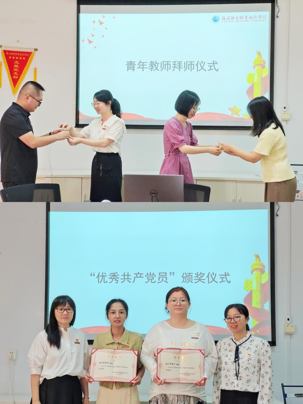 结合本次主题党日活动主题,直属马克思主义学院党支部开展了庆祝第39个教师节活动,全体党员教师在党支部书记熊美兰的带领下,共同立下铮铮誓言,牢记习近平总书记殷殷嘱托,牢牢扛起光荣使命。为充分发挥优秀骨干教师对青年教师的传、帮、带作用,使青年教师尽快成长,马院举行青年教师拜师仪式,邹亚彤、刘宗永两位新进教师分别向导师们敬茶、拜师。党支部书记熊美兰、副书记赖文金分别为获得2023年“优秀共产党员”的张茵珠、曾美玲两位同志颁奖,希望受到表彰的同志珍惜荣誉、发扬成绩,争取更大光荣。荣获“三育人先进工作者”的张茵珠老师作了交流分享,她表示在今后的工作中会更加积极配合,少点借口、计较,多点认真、用心,力争取得更好地成绩。