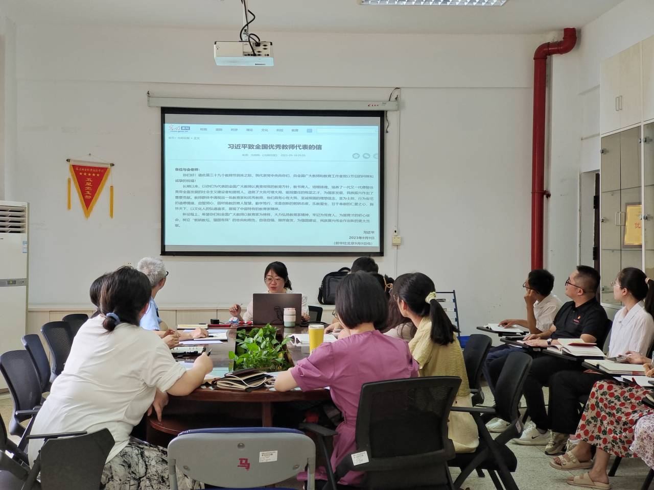首先,全体党员集体学习了《习近平总书记教育重要论述讲义》,领会教育是立德树人的事业,“国无德不兴,人无德不立”的重要意义。吴薇同志领读了“习近平总书记致全国优秀教师代表的信”,大家倍感振奋、深受鼓舞,也信心满怀、干劲十足。