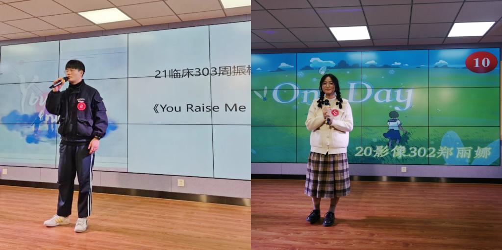 在复赛环节,选手们演唱了各自擅长的曲目,有的曲风深沉、动人心弦;有的曲调欢快、引人跟唱。其中,21级临床301班周振榕同学深情演唱的《You raise me up》,唱出了闽卫院学子对父母、对祖国真挚的感恩之情;20级影像301班的郑丽娜等同学激情演唱《One day》,表达了闽卫院学子对世界和平的由衷祝愿。
