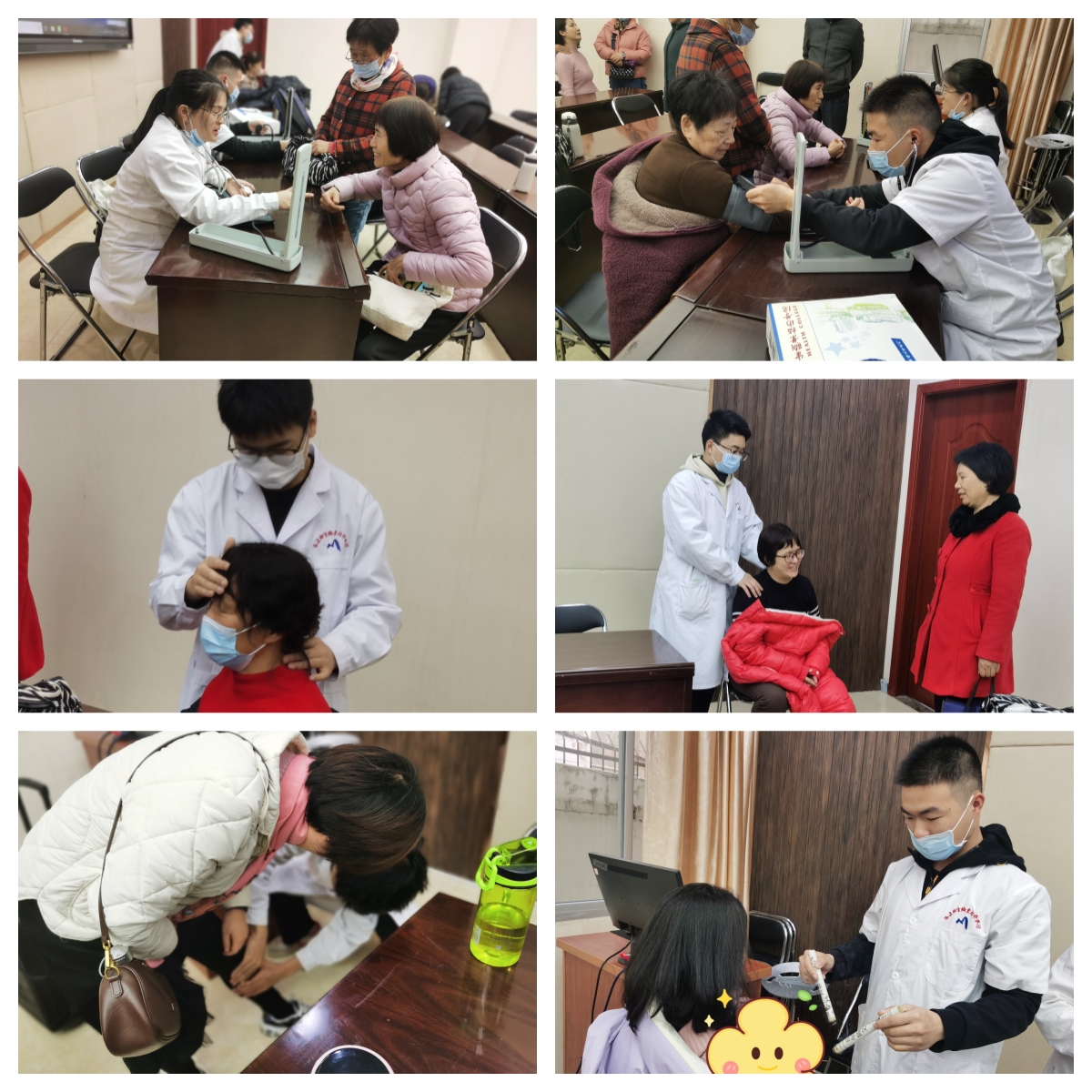 讲座结束后,由医学院学生组成的义诊团队迅速投入工作。他们为老年女性学员们进行了血压、血糖测量,心肺功能听诊等基础健康检查,并根据检查结果提供个性化的健康建议,同时针对部分老年学员的脊柱亚健康等问题进行手法松解、艾灸推拿。同学们认真细致的服务态度,让老年学员们感受到了浓浓的关怀。