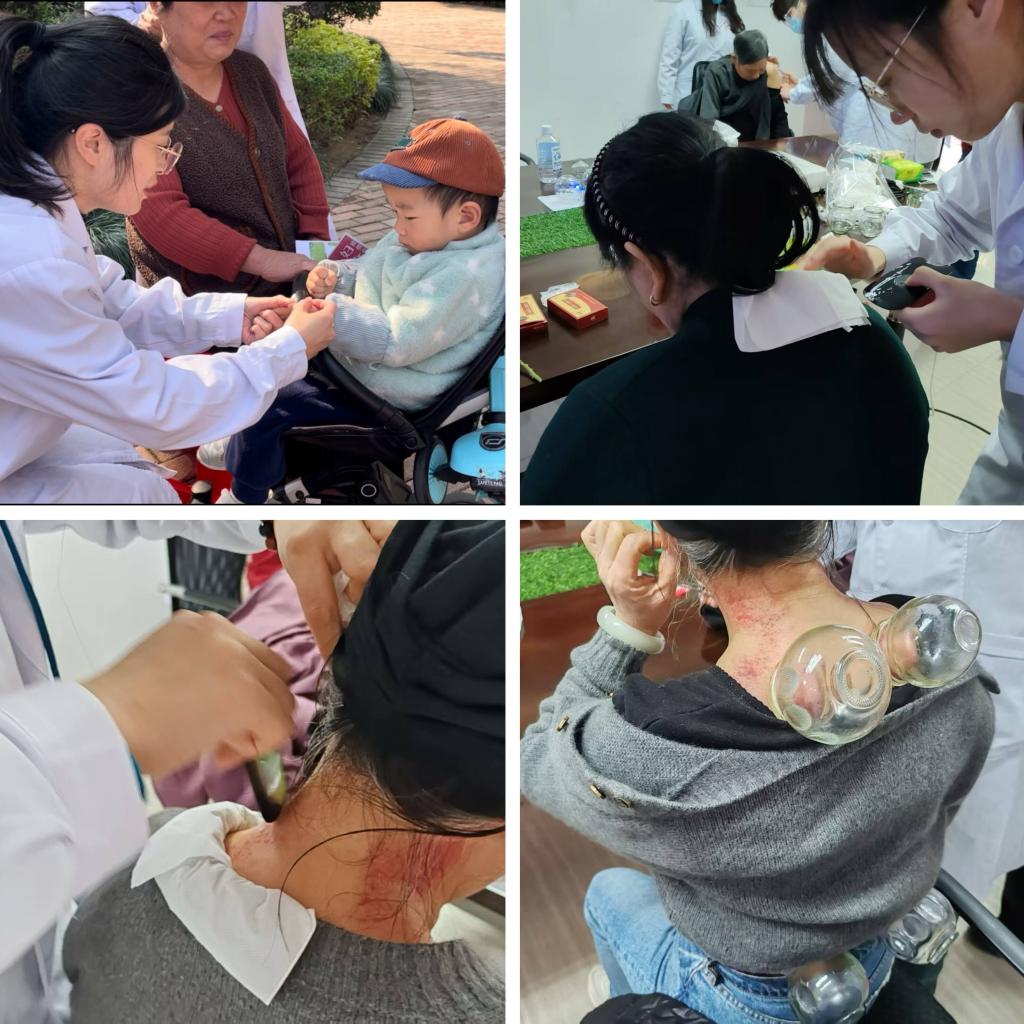 现场还设置中医适宜技术体验区,社团成员为居民提供耳穴贴压、成人推拿、拔罐、刮痧等服务。志愿者们耐心讲解操作原理,并根据居民需求给予个性化建议,受到一致好评。一位体验推拿的阿姨表示:“这些学生手法专业,服务贴心,让我对中医养生有了更深的认识!”