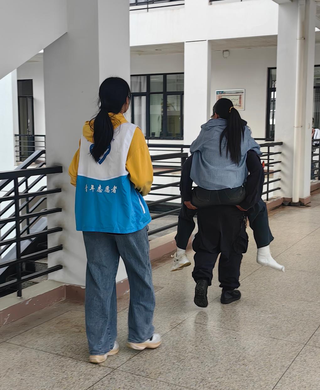 该考生因伤坐轮椅入校,看着在崇教楼四楼的考室心里犯了难。保安崔心衔和徐建林见状,主动上前伸出援手,在征得同意后,背起考生上了楼,又在考试结束后将其背下楼。这一举动不仅体现了学校对考生的关心和支持,更展示了学校始终贯彻服务育人理念,坚持德育工作走深走实。