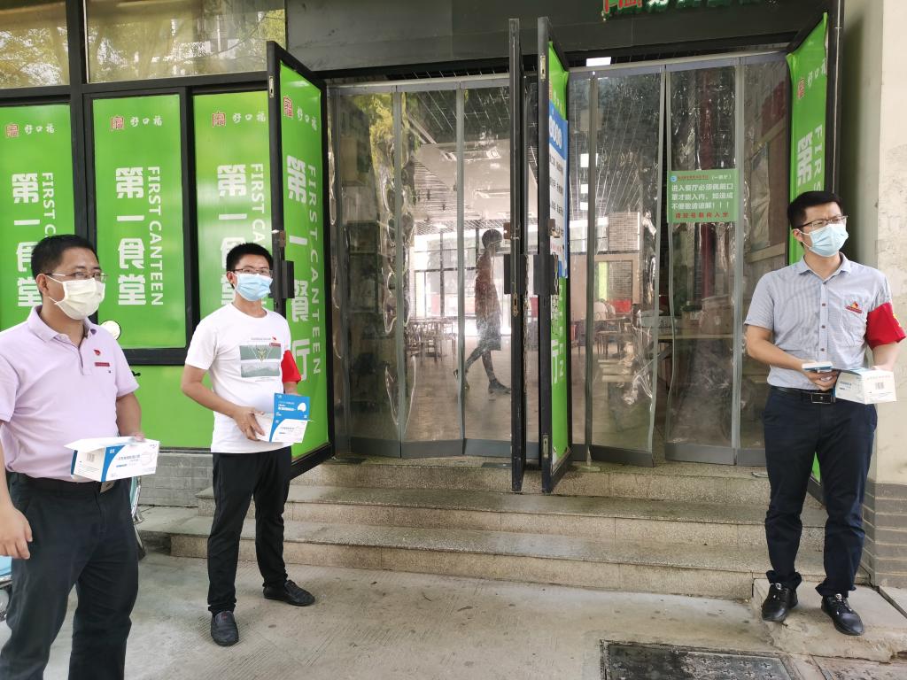 为了进一步提升学生的防疫意识,有效落实学校的疫情防控工作,支部党员在中午就餐时间到第一餐厅与明湖餐厅,为过往的同学们派发口罩,开展疫情防控和相关政策宣传活动,倡导师生及食堂工作人员养成良好的生活习惯,做好个人健康防护工作。