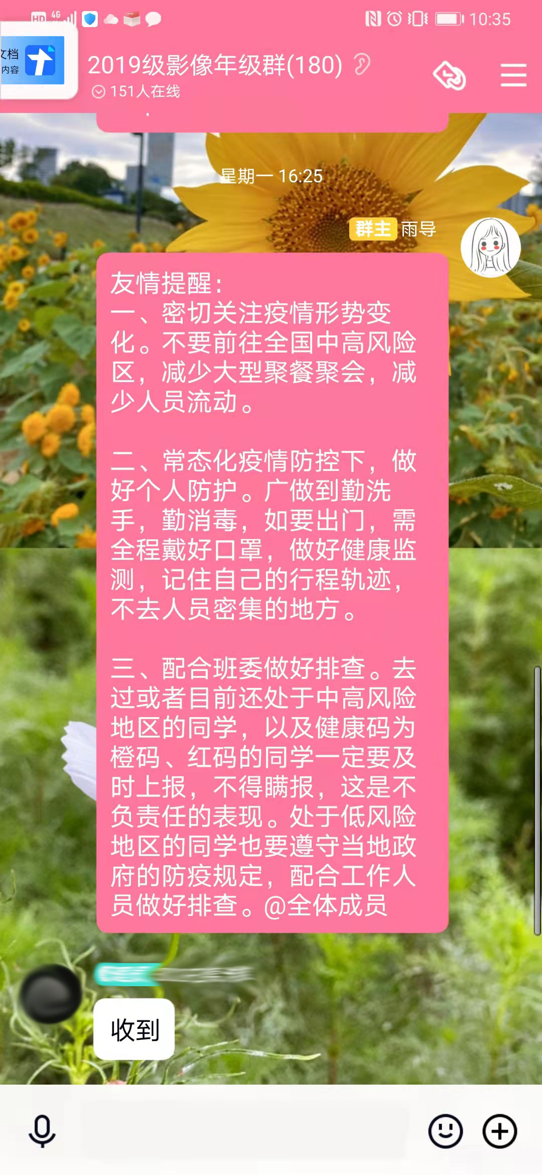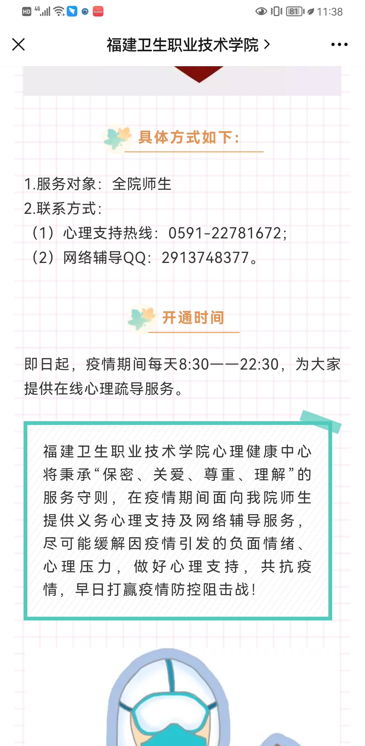 辅导员们还有另一个身份,他们也是中共党员,我省疫情发生以后,他们迅速集结为学生管理党员突击队,深入校园疫情防控的各个角落,关心学生的学习和生活,为学生排忧解难,处处飘扬着鲜红的党旗。在这没有硝烟的战“疫”中,每位闽卫院辅导员都心系学生,冲在前线,守岗履责,践行着身为一名高校辅导员的初心和使命。相信通过全校师生的共同努力,我们一定能够打赢这场疫情防控保卫战。