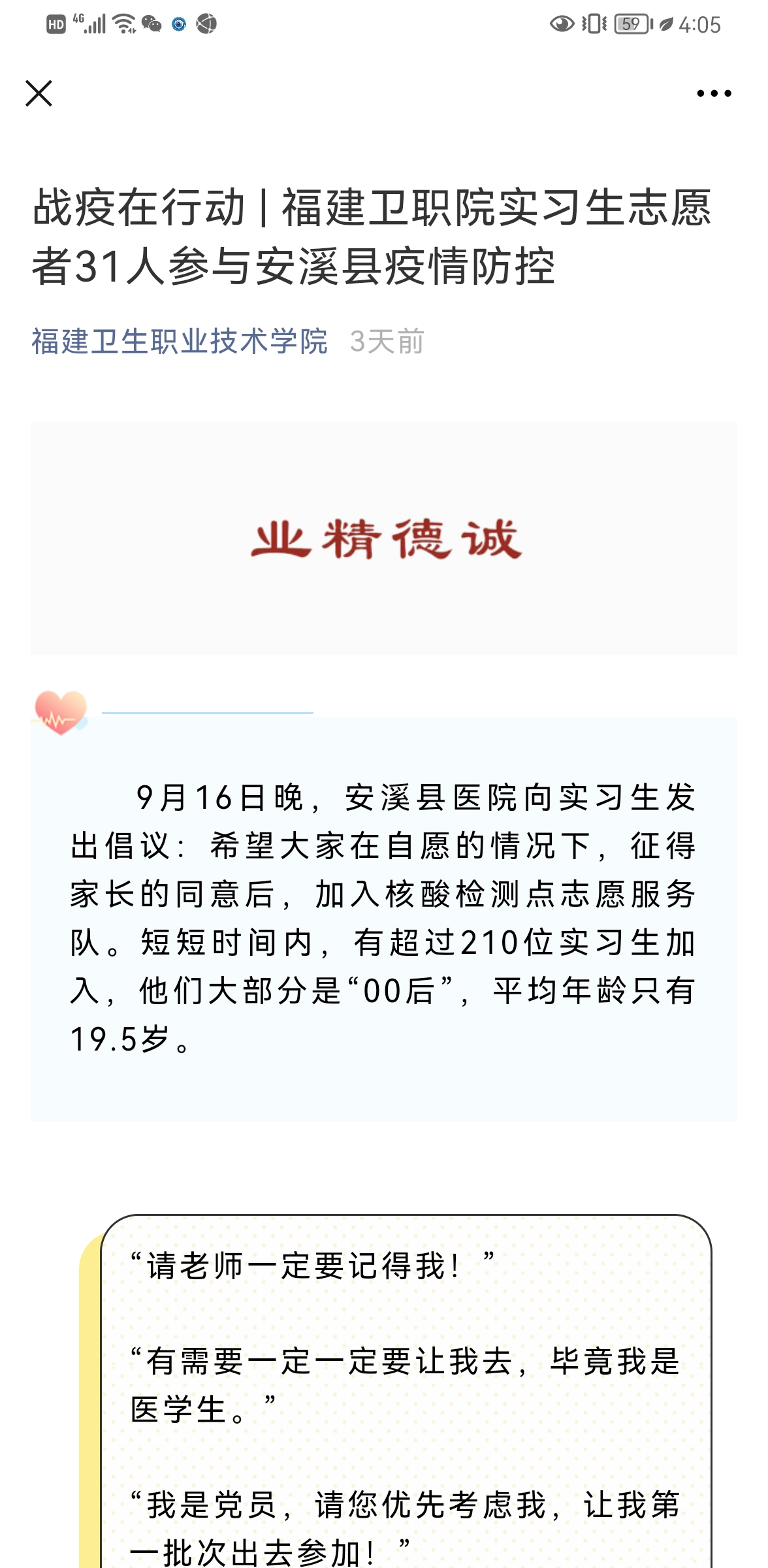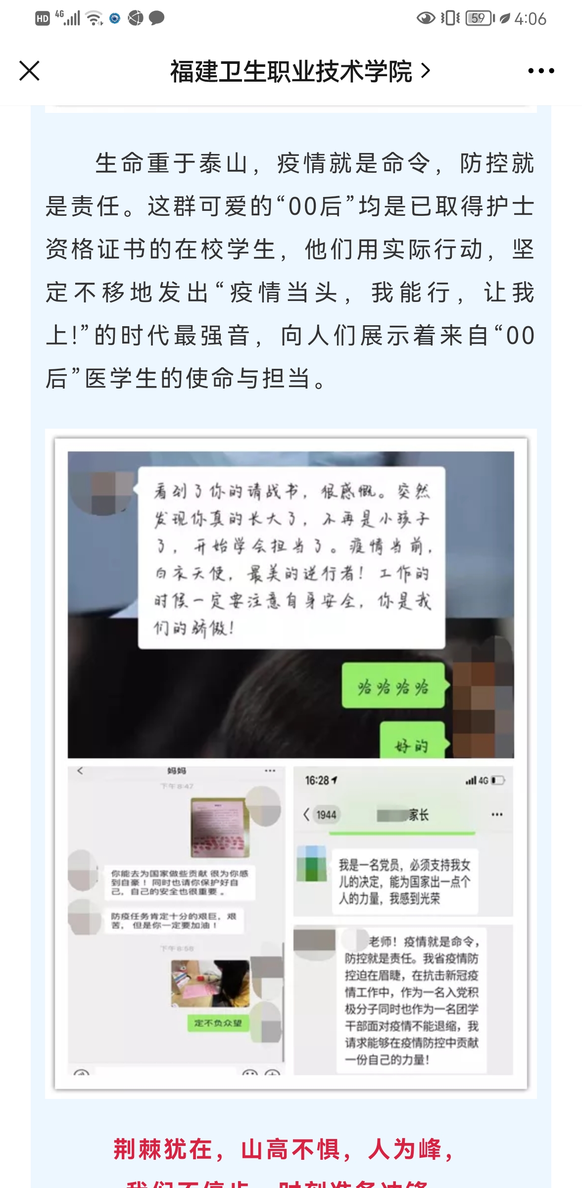 为进一步引导未来的医药卫生工作者正确面对疫情,积极号召同学们学习白衣天使们“疫”往无前,勇于担当的精神。全校辅导员积极了解广大实习生和毕业校友参加抗“疫”的故事和先进事迹,依托校院两级新媒体平台广泛宣传,不断坚定青年学子的信心,进一步弘扬爱国奋斗精神,引导学生把“小我”融入“大我”,勤奋学习,刻苦钻研,上好疫情防控这堂思想政治大课。