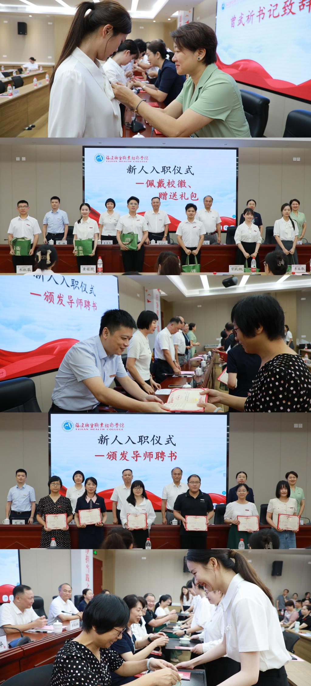 随后,校领导为新教师代表佩戴校徽,发放入职礼包,并为新教师导师颁发聘书,共同见证“师徒结对”的庄严一刻。