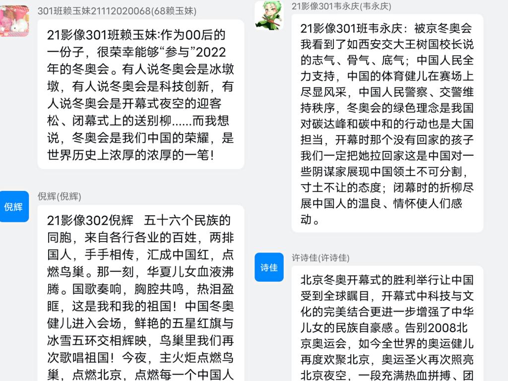 习近平新时代中国特色社会主义思想读书社社长、21婴托301班叶镓萍感慨:冬奥会带来的“C位”视角,让中国青年拥有了“平视世界”的民族自信,深切感悟到“两个变局”下的人生际遇与时代责任。中国青年要向奥运健儿学习,彰显“勇于担当”色彩,将青春“小我”融入祖国“大我”;中国青年要向冬奥志愿者学习,彰显“艰苦奋斗”色彩,以永不懈怠的奋斗姿态投入攀高峰、立事业的实践磨砺。