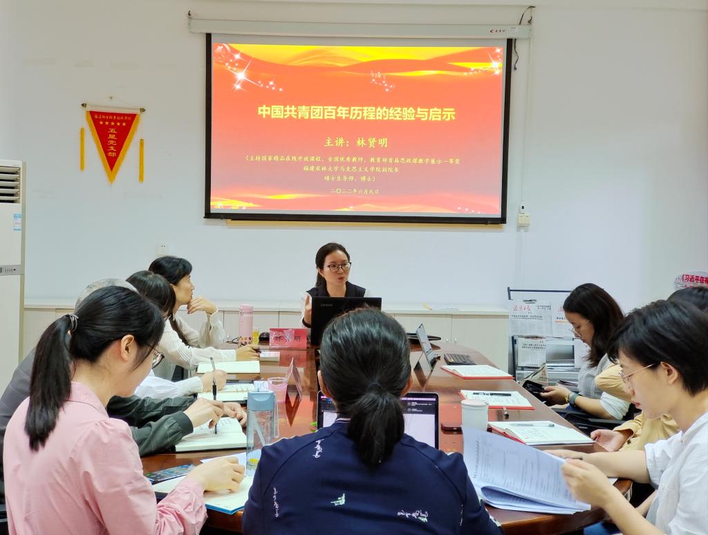 为从中国共青团百年历程中汲取精神力量,做好青年思想政治教育工作,2022年6月9日,开云马克思主义学院邀请福建农林大学马克思主义学院副院长林贤明作题为《中国共青团百年历程的经验与启示》的专题讲座。讲座由马克思主义学院院长熊美兰主持,全体专兼职思政课教师、学生代表参加讲座。