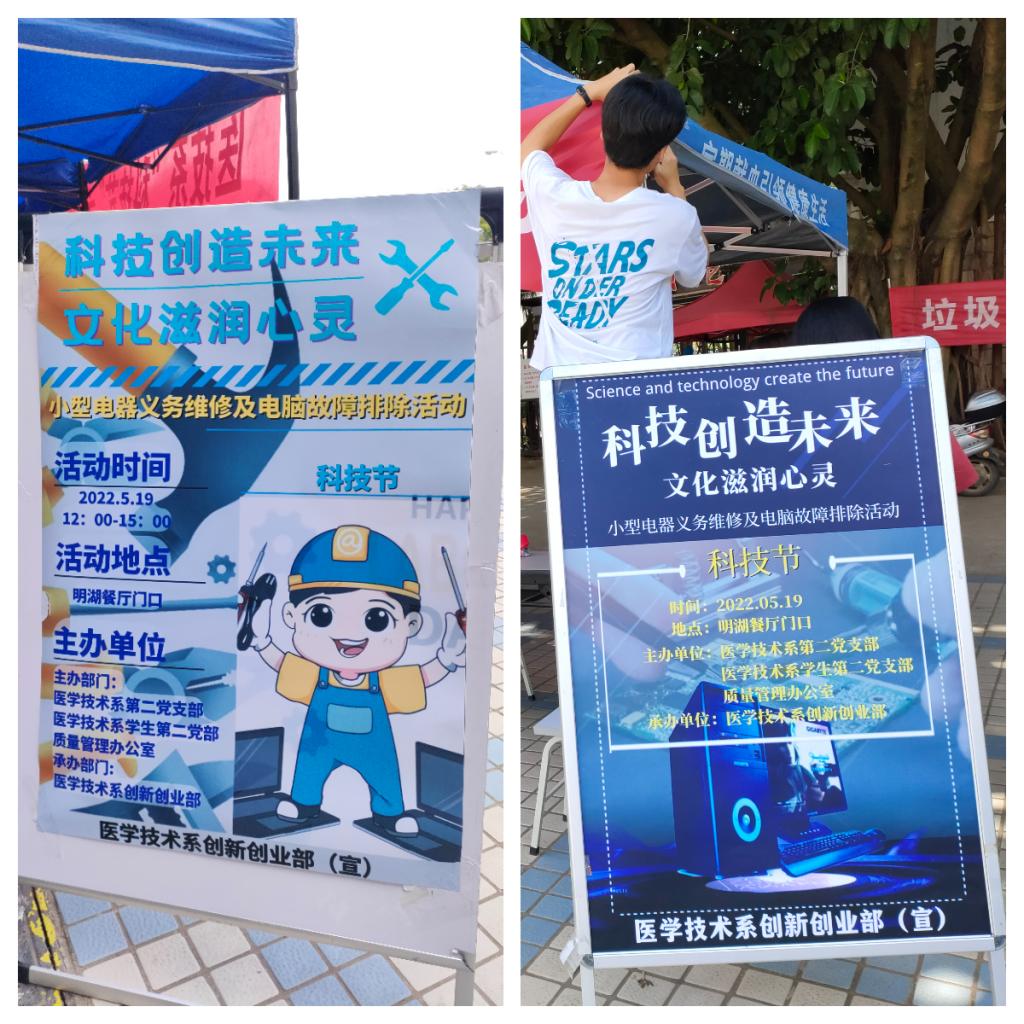 科技创造未来,技能造福人类。为响应学校提高大学生科学素质的号召,推进高校科学技术发展,秉承“业精德诚”的校训,近日,医学技术系第二党支部、质量管理办公室,医学技术系学生第一党支部及学生第二党支部联合系团总支创新创业部在明湖广场举办以“科技创造未来,文化滋润心灵”为主题的第二届科技节之小型电器义务维修及电脑故障排除活动。医学技术系及质量管理办公室领导莅临指导,各党支部的教师和学生党员以及入党积极分子参与活动。