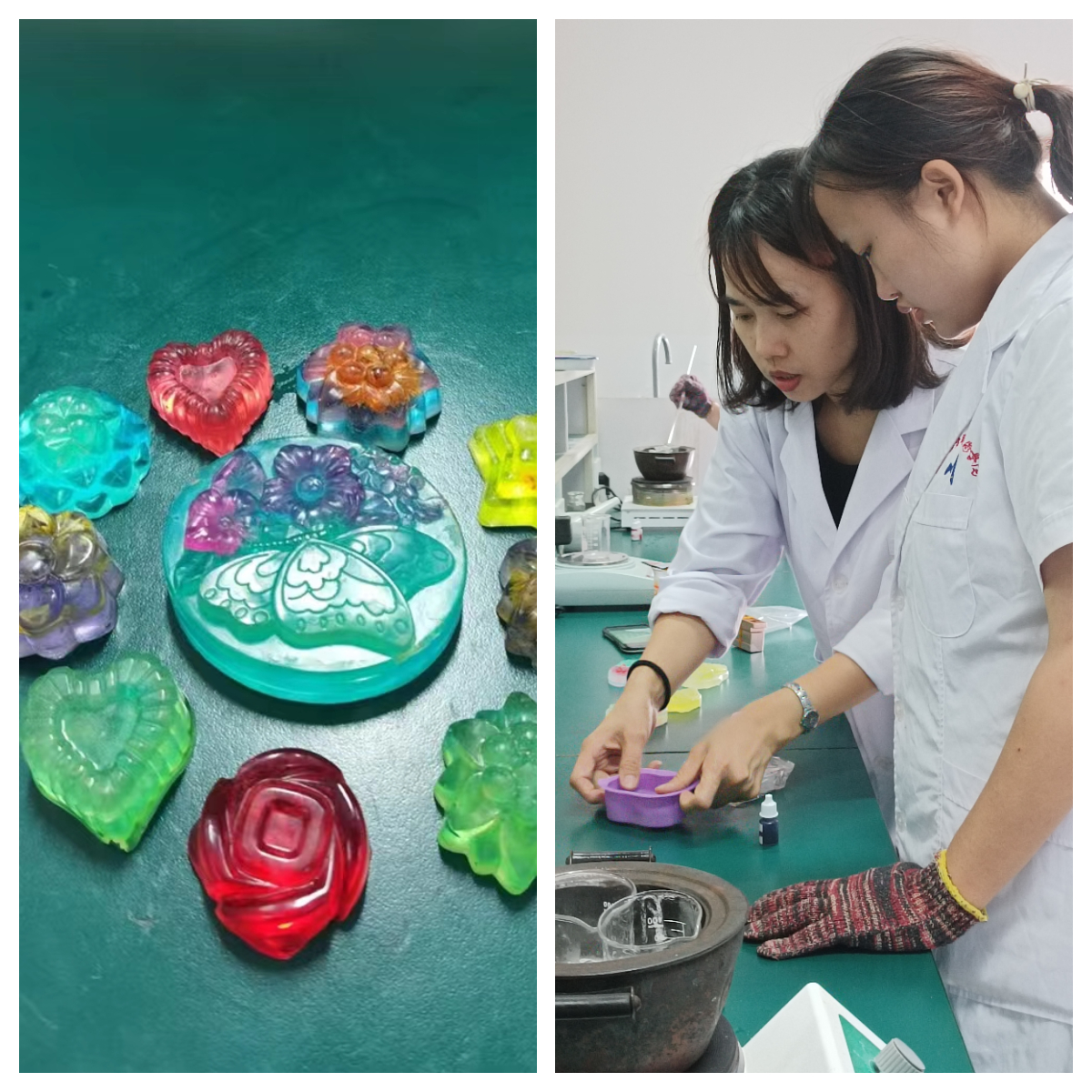 在手工皂制作环节,张丽华老师一边介绍制作步骤,一边示范操作,反复强调制作中的注意事项。现场学生表现出了极大的热情,选择自己喜欢的模具和颜色,将制成的手工皂液,倒入模具内,冷却、凝固、脱模。手工皂五彩缤纷、形态各异,其中有不少作品得到了老师的高度认可。