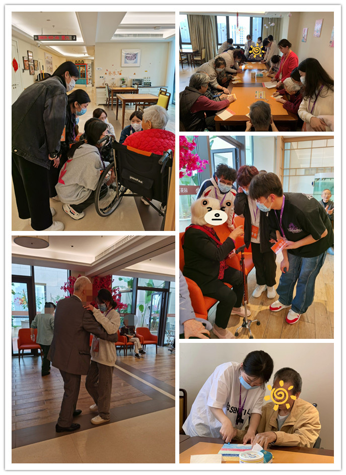 结束交流后,同学们在泰康之家工作人员的带领下,分组进入园区的护理公寓,在园区护理师团队老师的指导下,一同参与到在园区生活的长者们的文体活动中,与长者们一起完成一个小游戏、一幅画、一首舞曲,并送上对长者们的祝福。