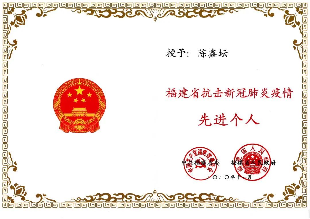 众志成城,硬核抗疫。在他带领下,统筹推进疫情防控和医院高质量发展,全院上下团结一心,成功治愈安溪首例新冠肺炎确诊患者,为全省县级医院自行治愈新冠肺炎第一家,实现零感染、零传播目标。医院党委被中共泉州市委、市政府表彰为“全市抗疫先进基层党组织”;广大干部职工白衣执甲、彰显担当,涌现出一大批先进典型,分别荣获福建省“五一劳动奖章”、泉州市“三八红旗手”等光荣称号;抗疫工作多次被人民日报、福建日报、泉州晚报等党报党刊以及学习强国平台宣传报道。他个人也被评为“福建省抗击新冠肺炎疫情先进个人”。