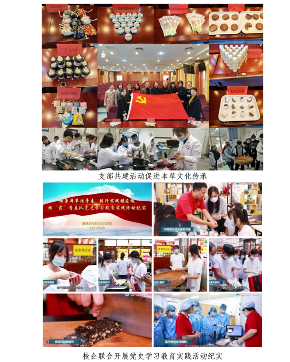 校企党建共建活动多样,开设讲座让学生了解闽西苏区时期中医药的历史贡献及三伏灸的当代价值,培育学生的家国情怀;拗九节让学生向老人们免费分发中药补益粥,践行“我为百姓做实事”的同时弘扬尊老敬老的孝道文化;端午节让学生向市民们免费发放预防新冠肺炎香囊,弘扬伟大抗疫精神,增强中药抗疫必胜的信心;让学生连续摇匾数小时,体验传统水丸制备的艰辛并培养持之以恒的耐心与毅力;让学生精炼蜂蜜,搓制成丸,亲身感受“修合无人见、存心有天知”的古训内涵并培养精益求精的工匠精神;让学生亲手制备货真料实的优质阿胶糕,体会阿胶使用由传统烊化到打粉助溶的转变,培养守正创新的意识及经营好药的良心;让学生仔细辨别市场常见伪劣中药,培养戒欺守诚的仁心。党支部还通过开展红色题材“药用植物标本制作”、“传统中药制剂技术传承”、“药膳药茶比武品鉴”、“防病强身香囊制作”、“老字号药店文化解读”、“师生同演中医药情景剧”等活动激发学生对知识、技能和才艺的渴求。