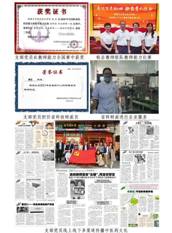 通过校企党支部携手共育技术技能型中药人才,学生专业技能水平显著提升,学生参加全国职业院校技能大赛高职组“中药传统技能赛项”比赛获一等奖1项,二等奖4项,三等奖2项,参加福建省职业院校技能大赛高职组“中药传统技能赛项”比赛获一等奖4项,二等奖8项,三等奖9项,参加企业中药技能竞赛获金奖。丰富多彩的第二课堂从德智体美劳对学生进行全方位培养。(附件5,6,7)