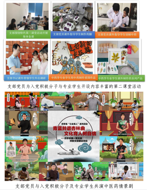 通过校企间党建的紧密合作,支部将“党建带动中药学专业发展”落到实处,面向学生、企业员工,制定特色人培方案,因材施教,精准培养。近3年,获评省级样板支部培育创建单位、省级“双带头人”支部书记工作室培育建设单位、省级先进基层党组织,校级五星级党支部、校级先进党支部,支部党员获评校级优秀共产党员3人、优秀党务工作者1人、三育人先进工作者1人。(附件1,2)
