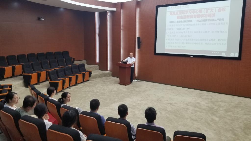 参观结束后,全体中心组成员在博物馆多功能厅召开党总支理论学习中心组(扩大)会议暨主题教育专题学习研讨,医学院党总支书记邱滚忠主持会议。与会人员围绕主题教育专题五:廉洁奉公树立新风——持之以恒推进全面从严治党进行集中学习研讨。医学院副院长邓元荣、副书记陈洁结合专题学习进行交流分享。