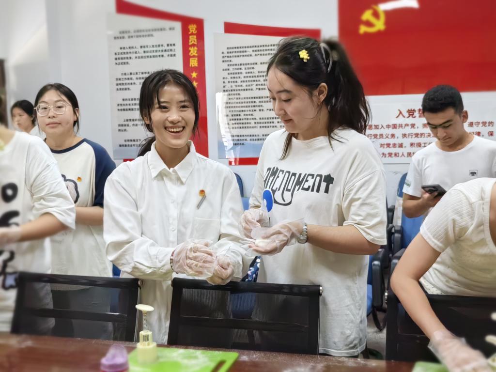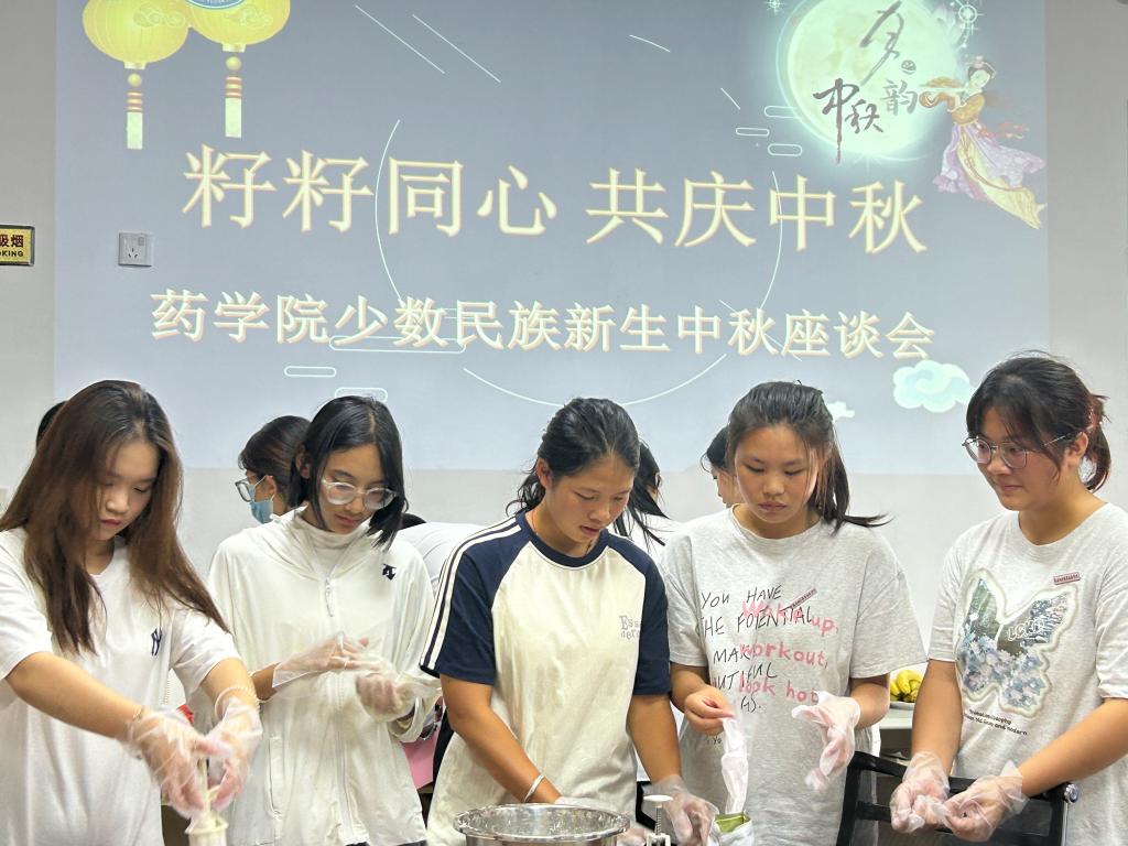 座谈会前,少数民族学生同药学院团学干部们一起制作月饼,感受指尖带来的节日欢愉,并收获亲手制作传统美食的欣喜。