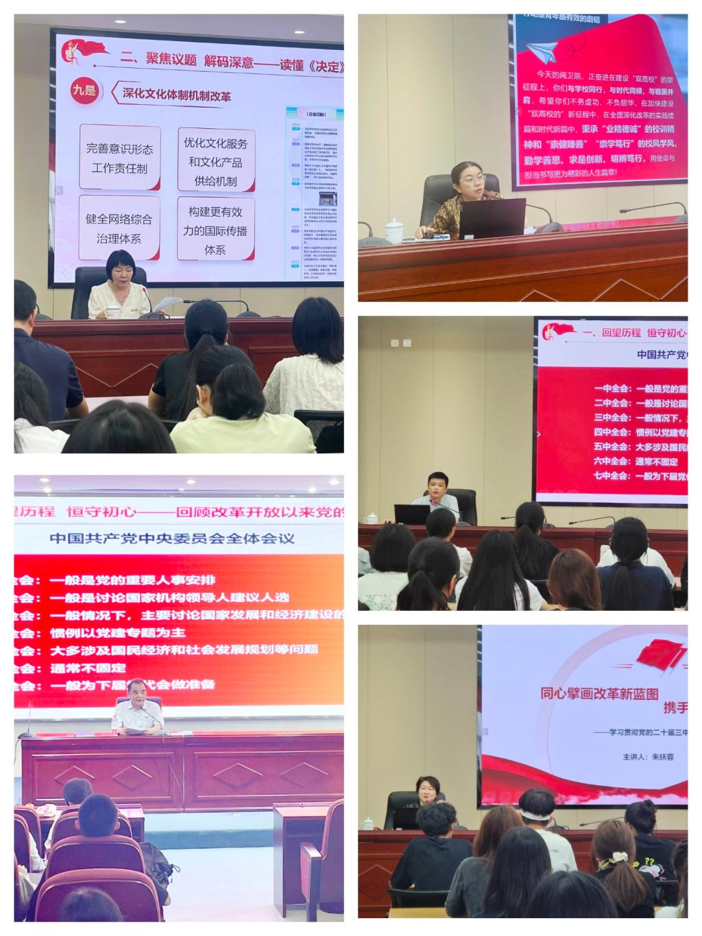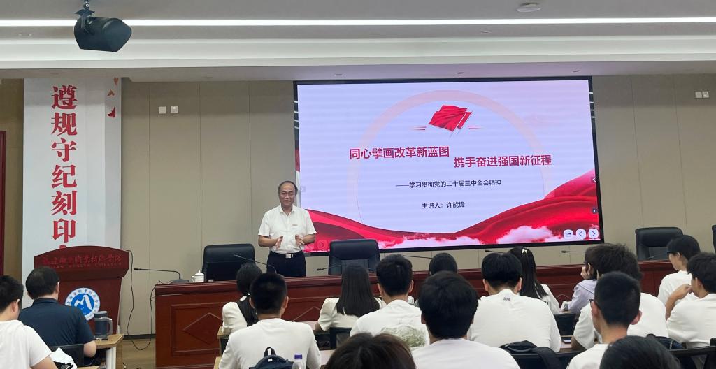 李美华、游锋、黄铭珊、周雄、朱扶蓉围绕深刻领悟党的二十届三中全会的重大意义、深入学习领会习近平总书记重要讲话精神、全面准确理解《决定》提出的进一步全面深化改革重大举措等方面进行了系统阐释和深入解读。他们深情寄语广大师生,今天的闽卫院,正奋进在建设“双高校”的新征程上,诸君应与学校同行,与时代同频,与祖国并肩,应不务虚功、不负韶华,在加快建设“双高校的”新征程中,在全面深化改革的实践续篇和时代新篇中,秉承“业精德诚”的校训精神和“崇健臻善”“崇学笃行”的校风学风,勤学善思、求是创新、明辨笃行,用使命与担当书写更为精彩的人生篇章。