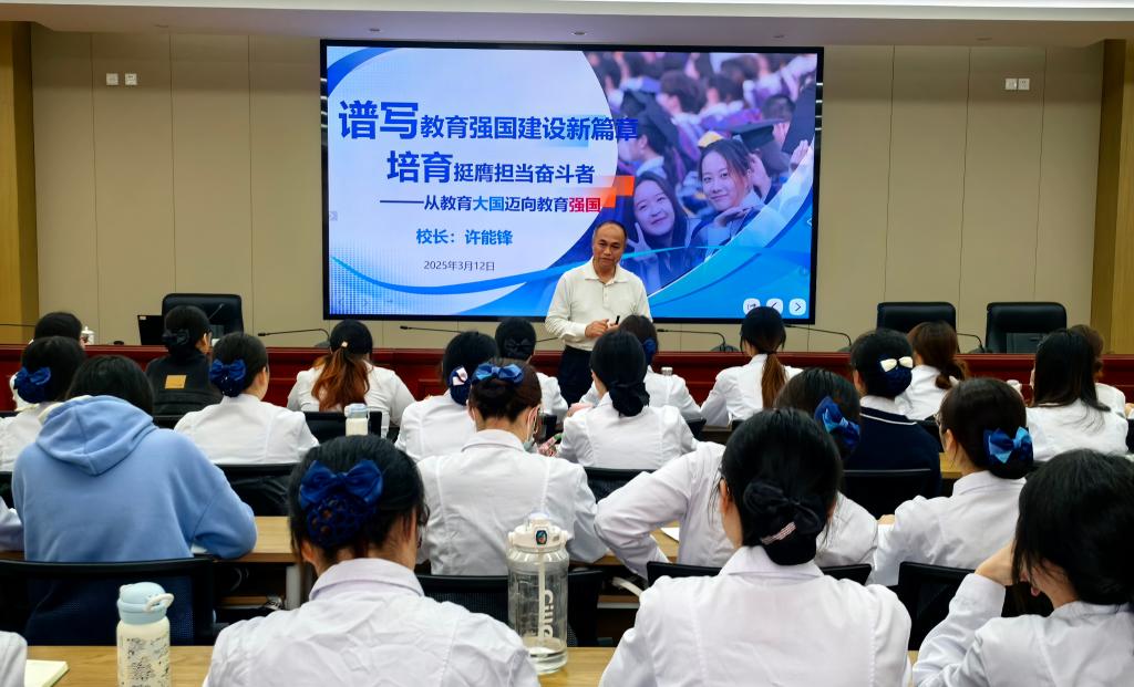 李美华、林玲、黄铭珊、周雄、朱扶蓉通过历史溯源、数据分析等形式,以“教育救国-教育兴国-教育强国”的历史脉络为主线,生动展现了我国教育事业的历史性跨越,系统阐释教育强国建设的“四梁八柱”。他们寄语闽卫院青年学子,在建设“健康中国2030”的战略机遇期,医卫青年既要锻造“仁心仁术”的专业品格,更需培育“国之大者”的格局视野,在县域医疗服务、公共卫生应急等国家需要的领域建功立业,让个人职业生涯与教育强国建设同频共振。