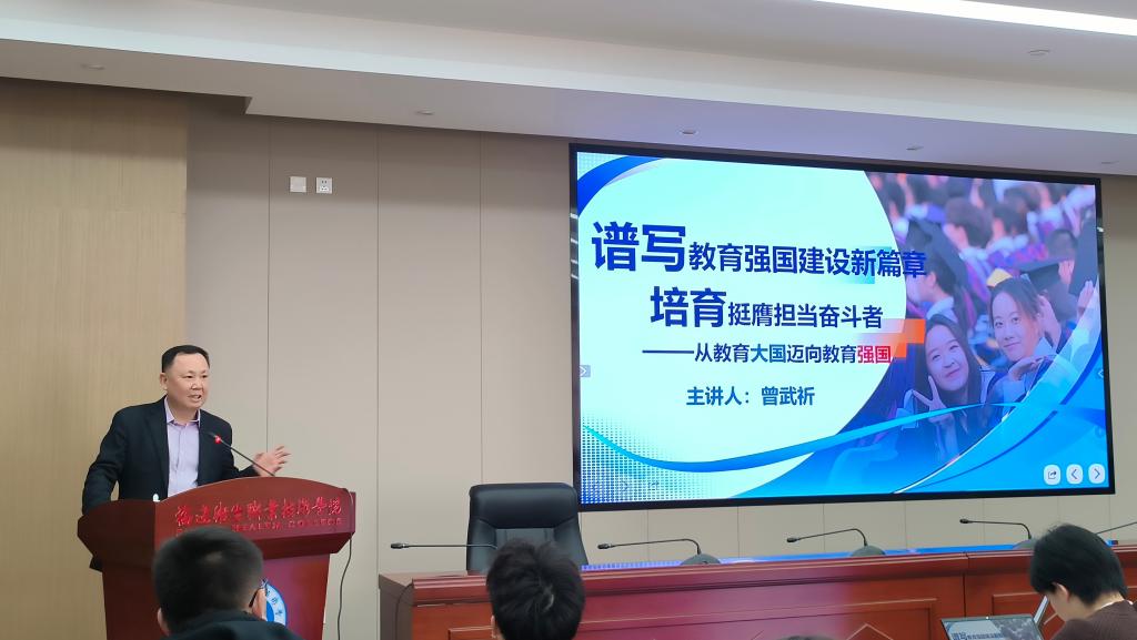 曾武祈以《谱写教育强国建设新篇章 培育挺膺担当奋斗者——从教育大国迈向教育强国》为题,围绕“坚实基础 战略支撑”“蓬勃发展 优质均衡”“深化改革 系统推进”“锚定目标 笃行实干”四个维度系统阐释了教育强国的战略意义与实践路径。他强调,建设教育强国是实现中华民族伟大复兴的基础工程,高校作为人才培养主阵地,要坚持党建引领,将思政教育贯穿育人全过程,着力培养 “政治坚定、技术精湛、医德高尚”的新时代医药卫生人才。