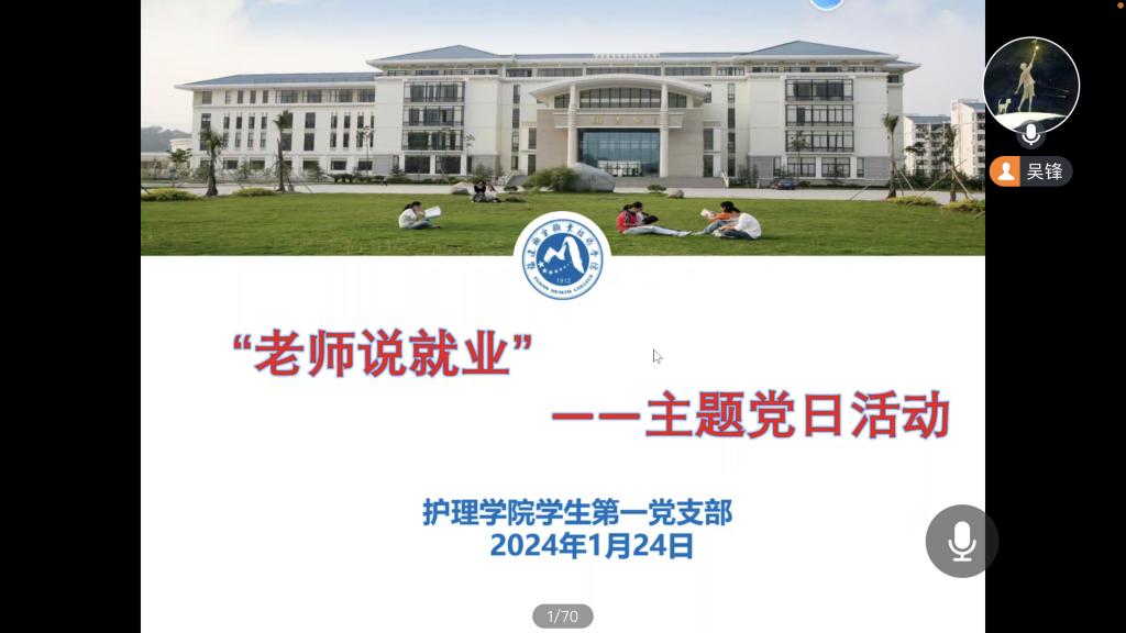 为贯彻落实全国、全省2024届普通高校毕业生就业创业工作会议精神,帮助毕业生高质量充分就业,切实发挥党建引领作用,聚焦解决学生“急难愁盼”问题,1 月24 日,护理学院学生第一党支部线上开展“老师说就业”主题党日活动,本次讲座邀请到原护理学院党总支书记、现任校党委组织统战部部长谢涛为护理学院2024届毕业生做专题分享,学生第一党支部书记吴锋主持会议,护理学院270多位同学线上聆听。