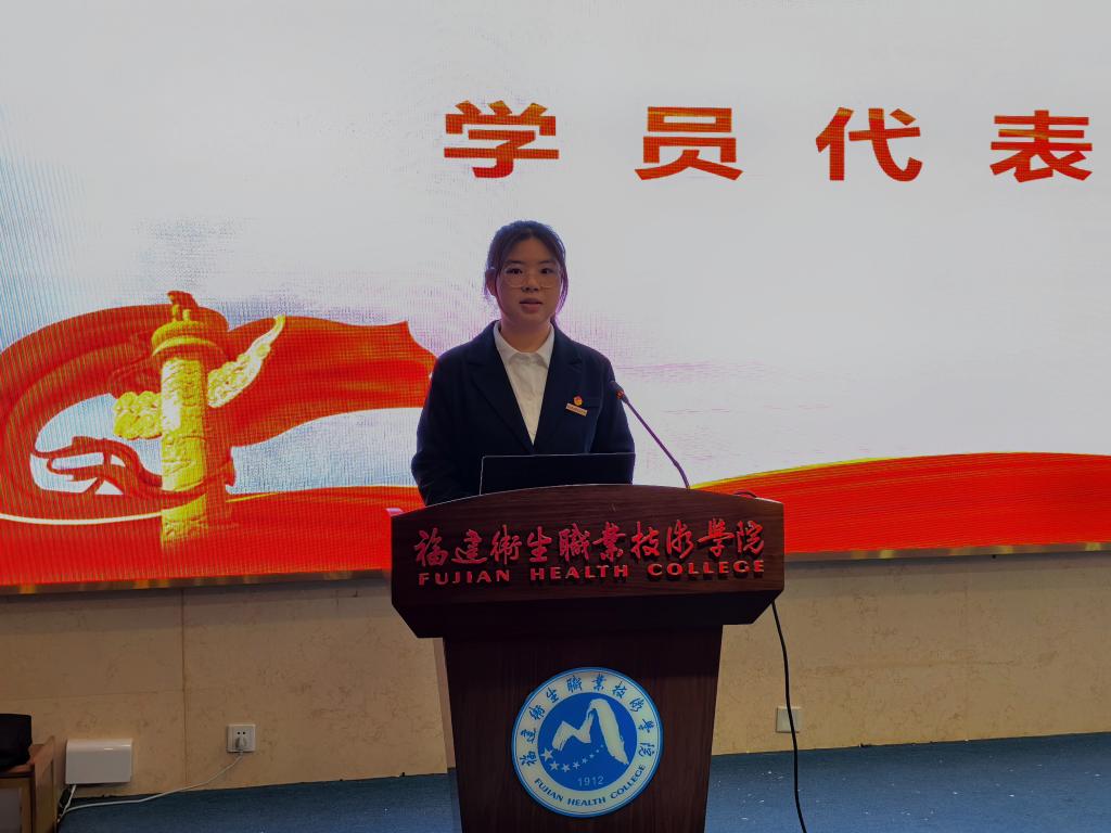 22检验303班檀小冰同学作为学员代表发言。她表示将以最饱满的热情投入培训班学习和活动,坚定信仰,知行合一,服务同学,服务学校,服务社会,以实际行动积极向党组织靠拢。