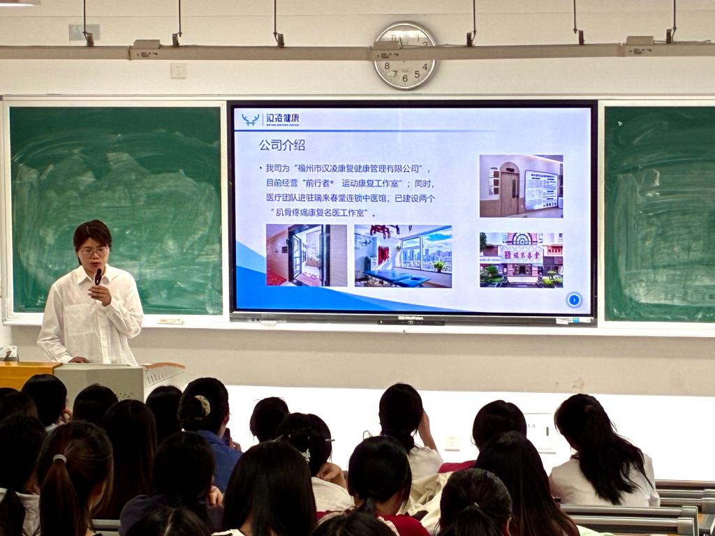 汉凌健康主讲人张洁系统介绍了企业的创建背景、核心团队构成、标准化工作环境及主要业务内容,重点解读了其优势项目肌骨疼痛调理的实际操作、岗位能力要求及阶梯式职业成长体系,让学生对现代康复领域的工作模式、专业发展空间有了具体的认知。宣讲过程中,企业代表结合自身多年从业经历,分享了中医康复从业者应具备的职业素养与责任担当,鼓励学子扎实锤炼专业技能,坚守职业初心,在传承中医精髓的同时,积极适配行业发展新需求。