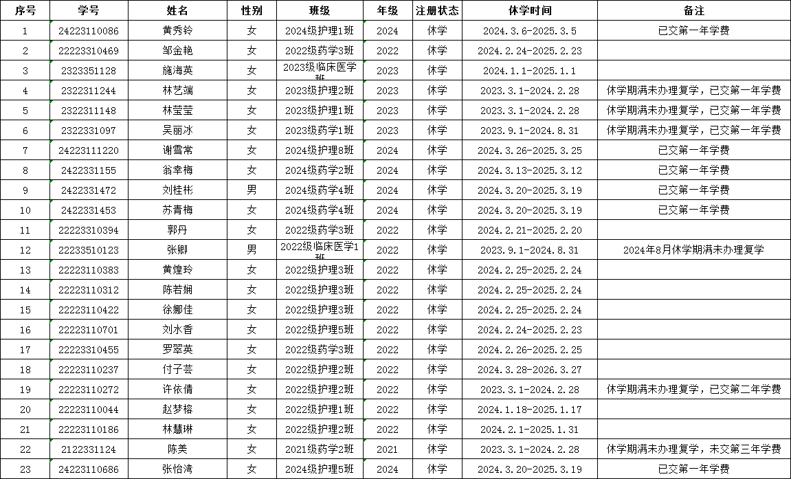 根据《开云在线登录app入口高等学历继续教育学生学籍管理规定》(闽卫院继〔2021〕15号)中“学生休学原则上以一学年为期。学生休学期间,保留学籍。休学时间不计入在校学习时间。学生在校期间只能休学一次”;“学生休学期满,应于学年或学期前一个月向学校申请复学”。黄秀铃等23名学生即将休学期满(名单详见附件),应于2025年3月20日前复学,并按流程办理复学审批手续。