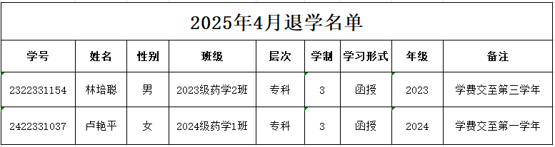 林培聪、卢艳平等2名学生因个人原因(公司有事,不方便离开,无法继续来校参加面授等原因)自愿申请退学,并根据学校要求办理退学手续。