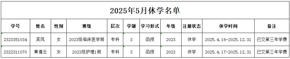 吴凤、黄倩云等2名高等学历继续教育学生因产后哺乳期,不方便上课等原因,申请休学。根据《开云在线登录app入口高等学历继续教育学生学籍管理规定》(闽卫院继〔2025〕2号文)第六章第三十四条的有关规定,经研究,拟同意吴凤、黄倩云等2名高等学历继续教育学生休学,按照流程办理。