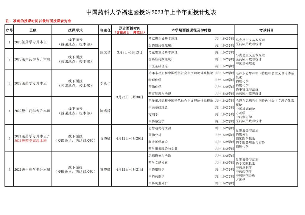 中国药科大学福建函授站2023年上半年面授计划表(专升本/2021级高起本)