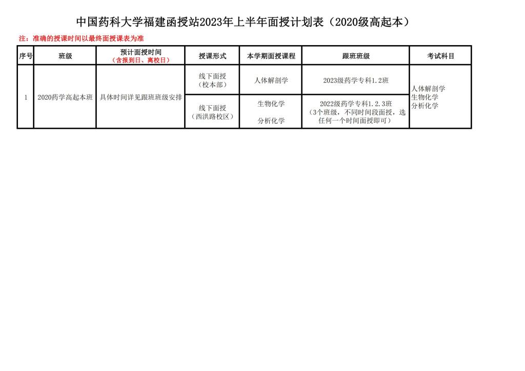 中国药科大学福建函授站2023年上半年面授计划表(2020级高起本)