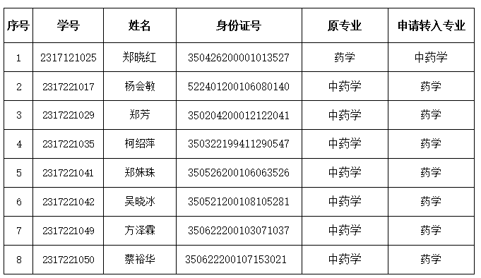 根据中国药科大学继续教育学院相关管理规定,2023级郑晓红等8人因个人工作需要等原因,提出转专业申请,经班主任审核,我站研究审议,该3名学生符合转专业条件,同意转专业,并上报中国药科大学继续教育学院审批。 现将转专业名单予以公示,公示期1月8日至1月12日,如有异议,请以书面形式在公示期内向我站反馈。联系电话:0591-22869959