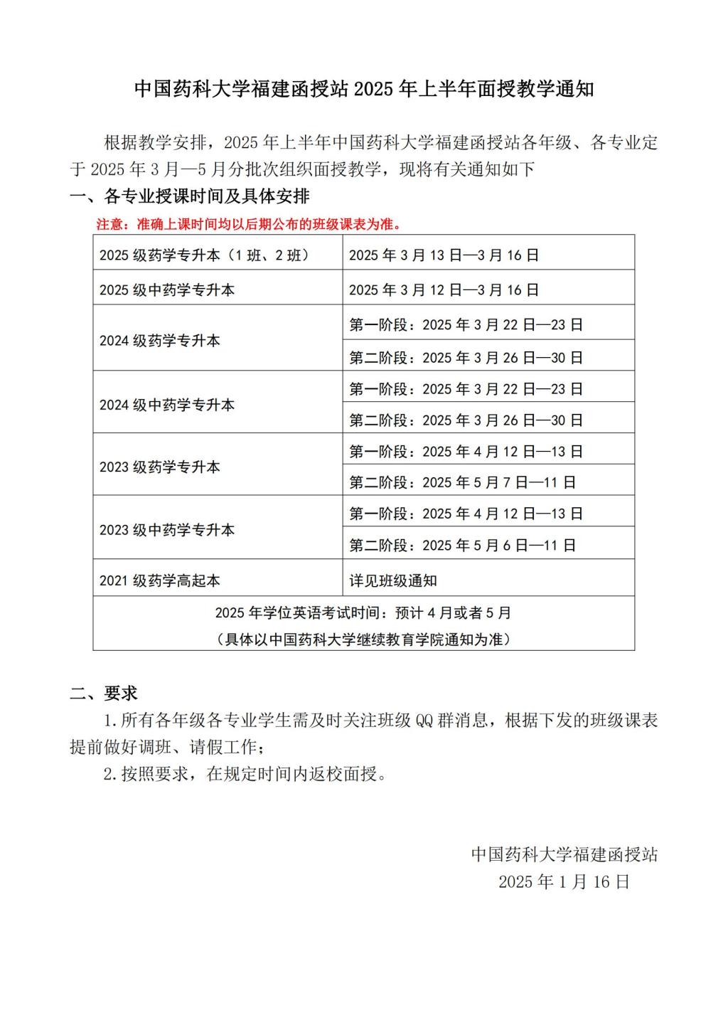 中国药科大学福建函授站2025年上半年面授教学通知