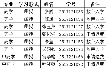 经班主任联系确认、函授站核查, 中国药科大学高等学历继续教育2025级张腾等8名新生逾期未缴费或申请退费、未办理入学手续,现将相关情况予以公示。