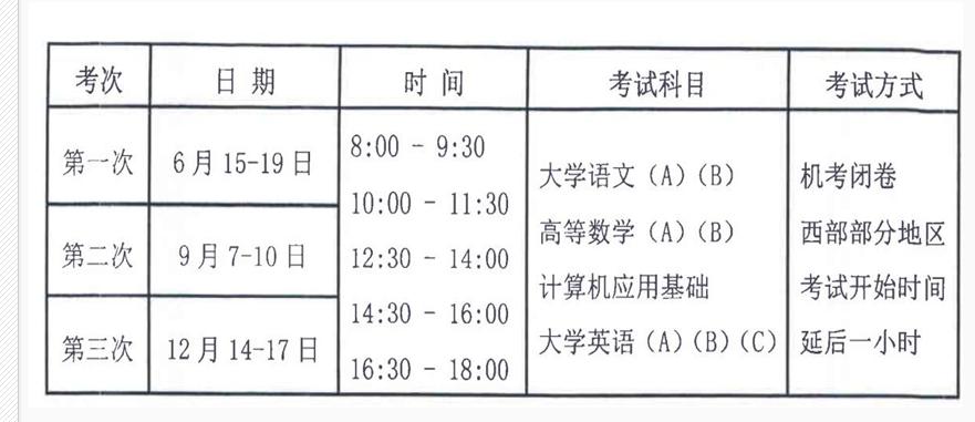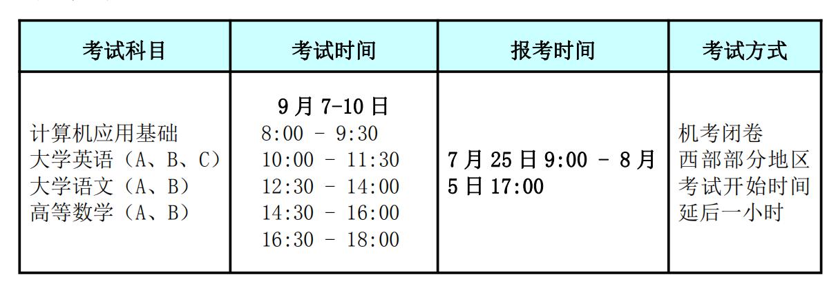 (1)《计算机应用基础》、《大学英语》B两门统考课程全部采用混编考场方式。报考时间如下: