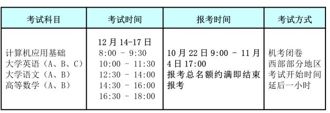 (1)《计算机应用基础》、《大学英语》B两门统考课程全部采用混编考场方式。报考时间如下: