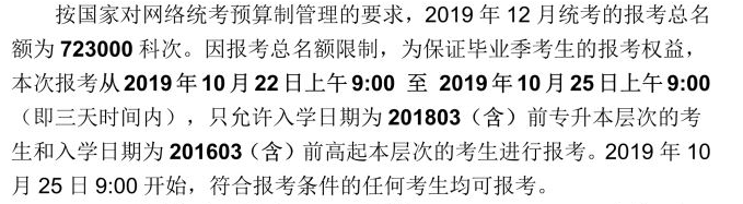 考试时间:2019年12月14--17日,每门课程考试时间90分钟。报名缴费时间:从2019年10月22日9:00开始至11月4日17:00。