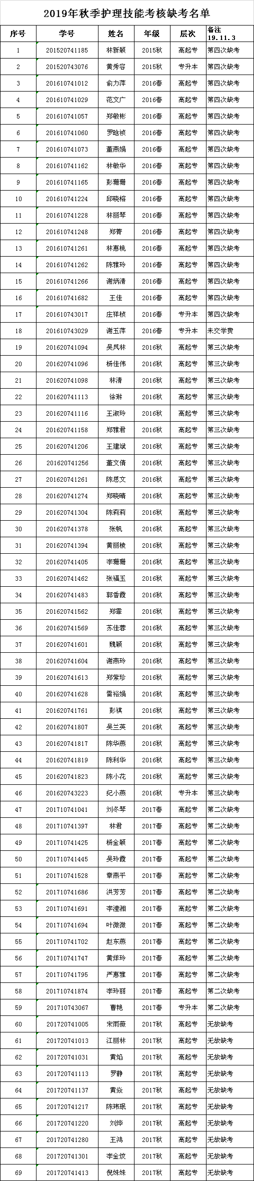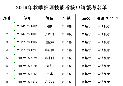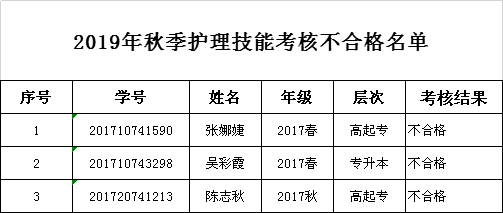 北京中医药大学远程教育开云在线登录app入口学习中心2019年秋季护理技能考核工作已于11月3日完成,现将考核不合格名单公示如下,请不合格同学及时关注学习中心网站(开云在线登录app入口官网http://www.fjwzy.cn/jjzx/ycjy/bjzyydxycjyfjwszyjsxyxxzx/jxtz.htm)或者微信公众号的通知,并于明年春季参加补考。