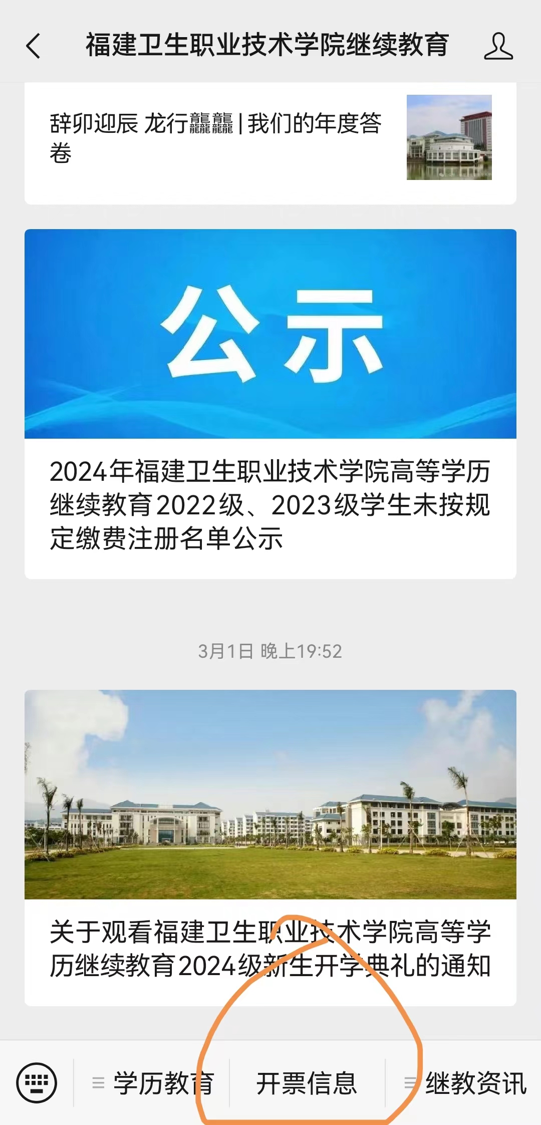 接财务通知,2024年本校高等学历继续教育专科学费发票已开具,现将学费开票信息公布给学生自行查询(微信公众号“开云在线登录app入口继续教育”——开票信息),学生根据开票信息登录微信小程序“电子票夹”手工查询下载学费电子发票。