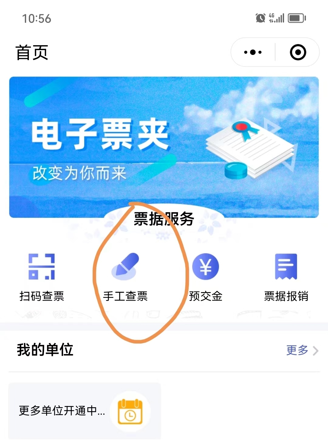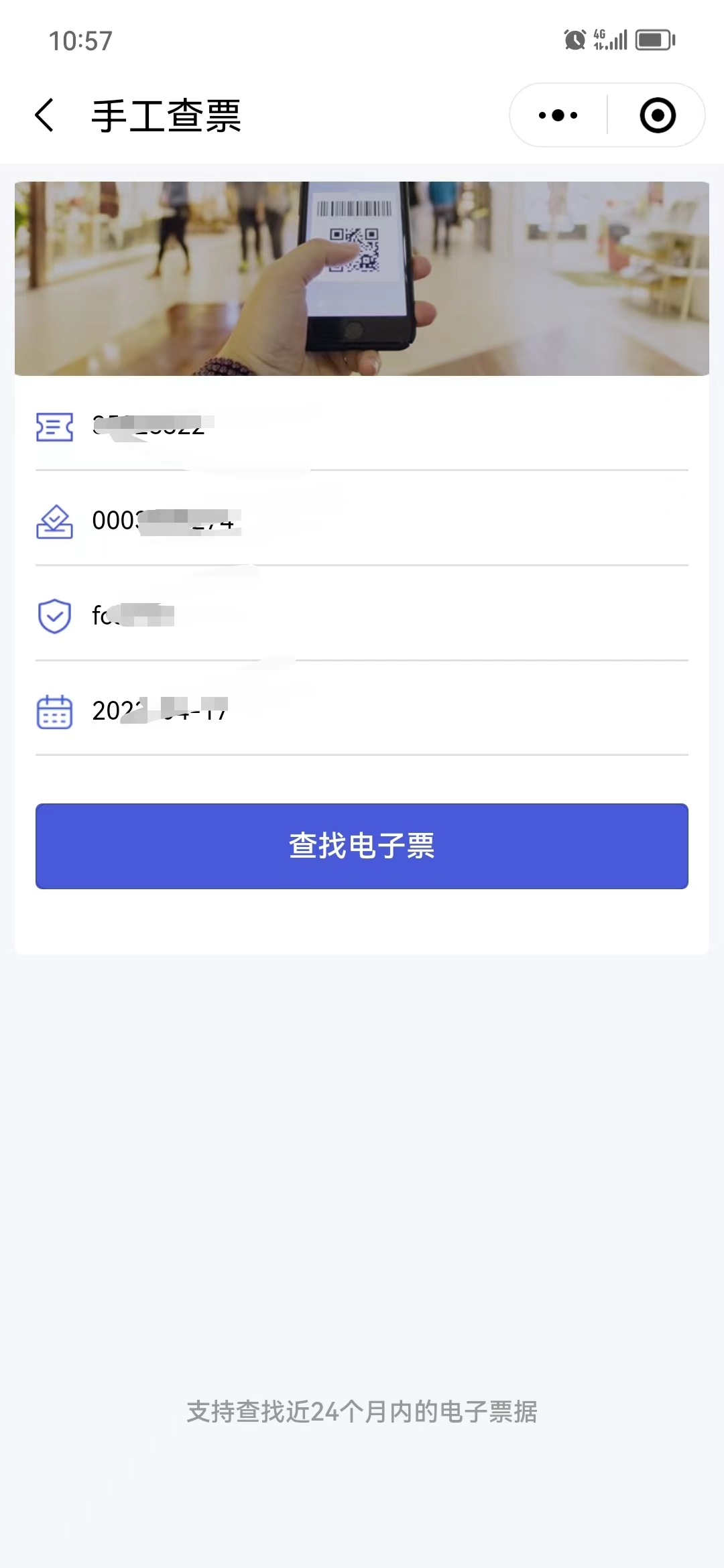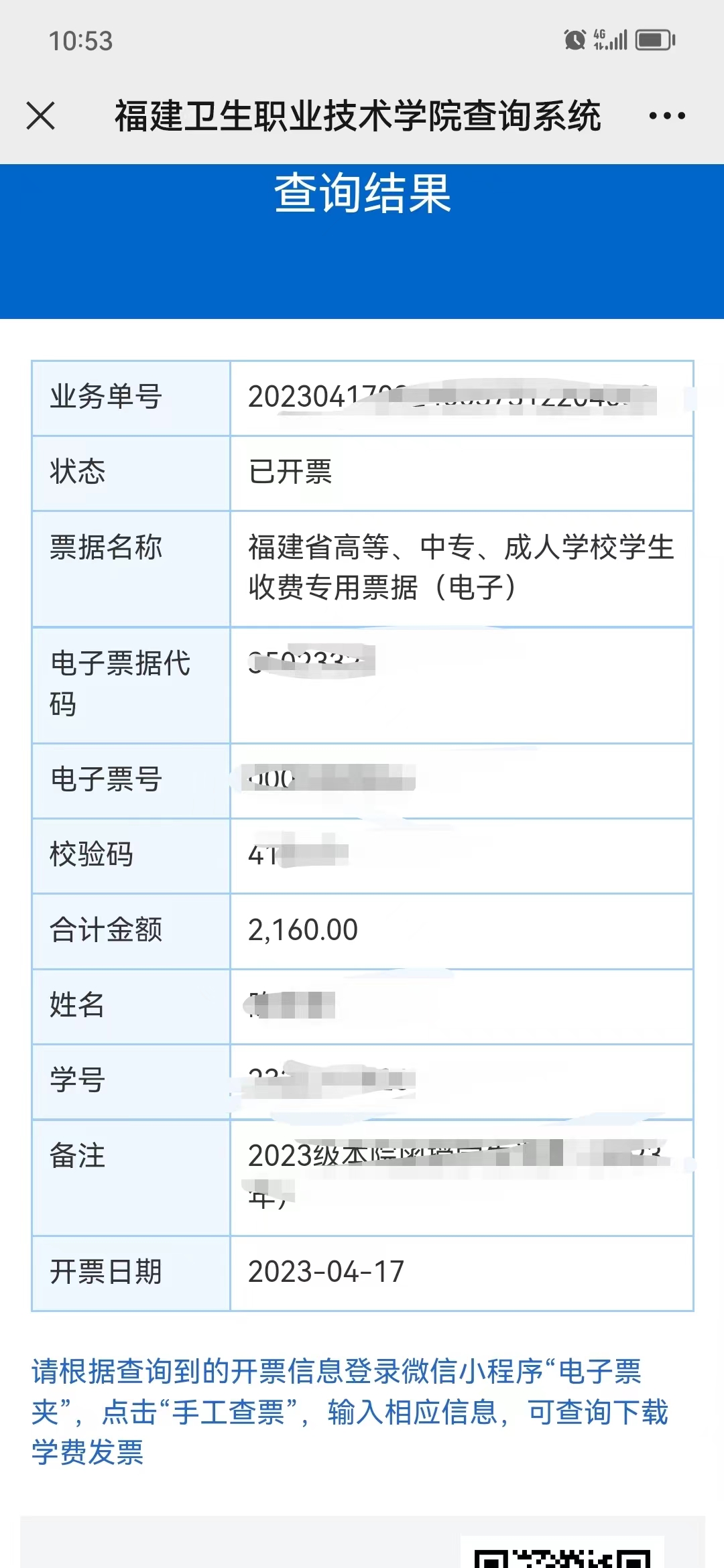 2.登录微信小程序“电子票夹”(福建博思软件股份有限公司),点击“手工查票”,输入“票据代码”、“电子票号”、“校验码”、“开票日期”后点击“查找电子票”,即可查看学费电子发票。可点击“保存至票夹”后,可直接下载,也可选择发送自己邮箱。