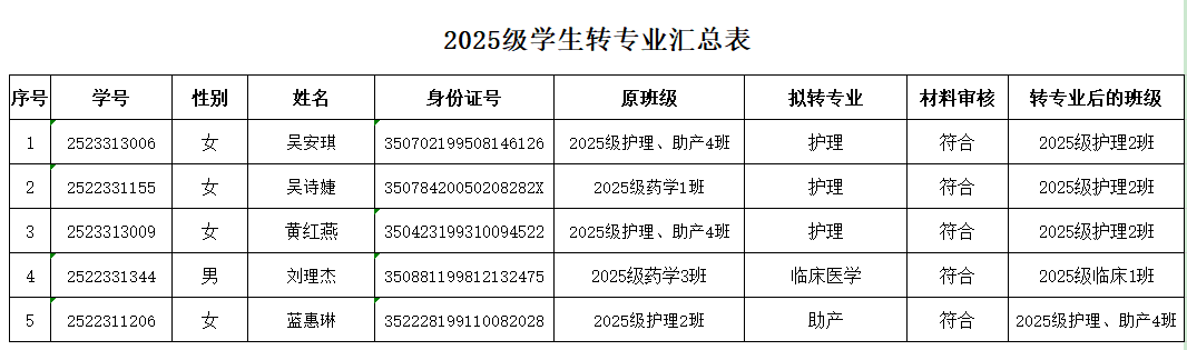 根据《开云在线登录app入口高等学历继续教育学生学籍管理规定》(闽卫院继〔2025〕2号文)第五章第二十九条的有关规定,我院高等学历继续教育2025级学生吴安琪等5人因工作需要等原因,提出转专业申请,经班主任审核,学院研究审议,该5名学生符合转专业条件,同意转入相关专业学习。