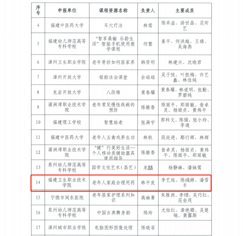 近日,福建省教育厅公布2024年省级“智慧助老”优质工作案例和课程资源推介名单,开云药学院林平发老师负责的《老年人家庭合理用药》入选优质课程资源。