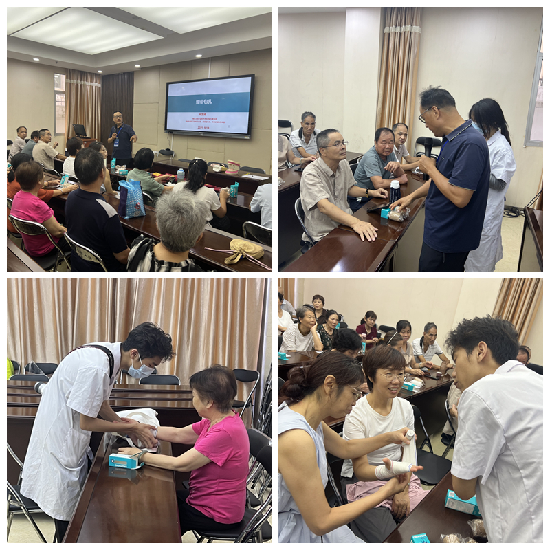 在随后开展的急救技能培训环节,现场氛围迅速升温。医学院林国威副教授以“实用场景化教学”为核心,聚焦老年群体日常易遇的磕碰擦伤、关节扭伤等场景,将绷带包扎技能作为培训重点,系统讲解其操作原理、适用情况与关键步骤。讲解过程中,林国威教授结合人体模型示范,从绷带的起始缠绕方式、不同部位的包扎技巧,到松紧度的把控要点、打结的安全规范,每一步都细致拆解;学生志愿者则分组上前,手把手指导老年学员实操,耐心纠正包扎位置偏移、力度不当等问题。学员们边听边练,主动模拟场景实操,在互动交流中逐步掌握正确包扎流程,真正实现急救技能“学到位、用得上”。