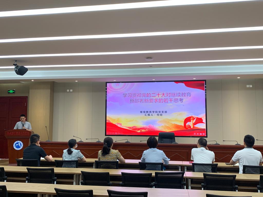为深入学习贯彻党的二十大精神,5月31日,继续教育学院党支部于行政楼6楼会议室开展支部书记讲党课活动,由支部书记何烜带领支部党员共同学习党的二十大对继续教育的新部署新要求,并结合实际工作展开讨论。