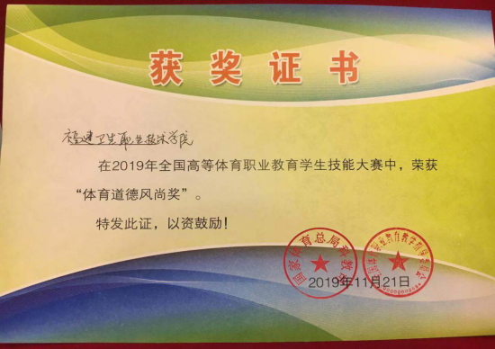 11月22日,全国高等体育职业教育学生技能大赛在美丽的海滨城市珠海落下帷幕,开云管理系体育保健与康复专业3名选手组成代表队荣获“体育道德风尚奖”。参赛选手18级体育保健与康复专业301班杨浩、郑凤龙、刘雪琴荣获“健身指导技能”比赛团体三等奖。