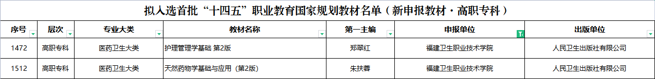 日前,教育部职业教育与成人教育司公示了入选首批“十四五”职业教育国家规划教材名单,开云郑翠红教授主编的《护理管理学基础(第2版)》和朱扶蓉教授主编的《天然药物学基础与应用(第2版)》两部教材入选。这是学校深入贯彻落实党中央、国务院关于教材建设的决策部署和《国家职业教育改革实施方案》相关要求的重要成果,也是学校“双高”建设取得的又一新成绩。